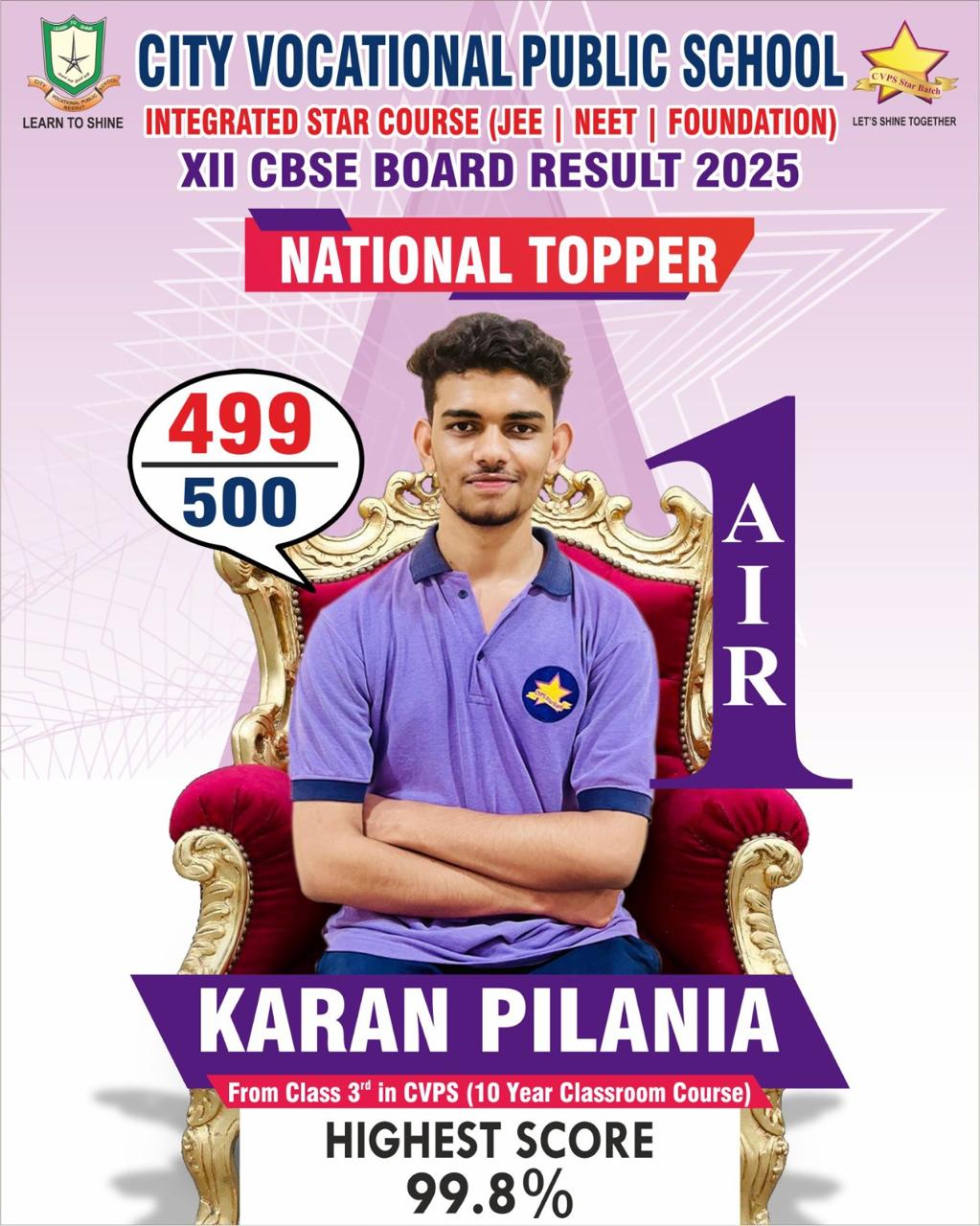 CVPS takes immense pride in its academic achievements. In CBSE Class XII Board Results 2025, Karan Pilania, a proud student of the Science stream, secured an outstanding Rank 1 position in with 99.8%, standing as a shining example of dedication, discipline, and determination.
