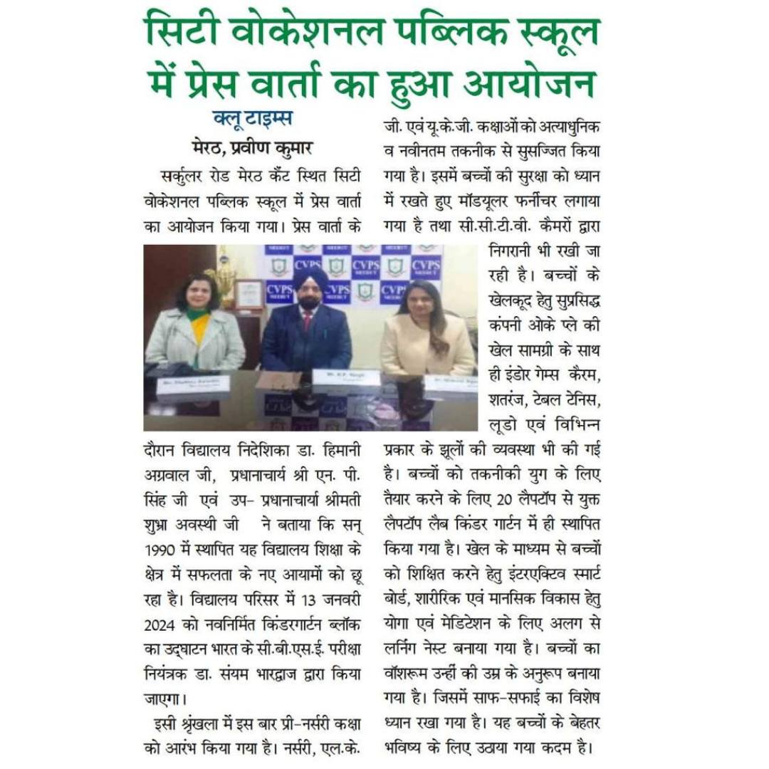 A press conference was organized at City Vocational Public School. The Director of School Dr. Himani Agarwal, Principal Mr. N.P. Singh and Vice Principal Ms. Shubhra Awasthi apprised the reporters that the school was established in 1990 and has been soaring to greater heights since then.