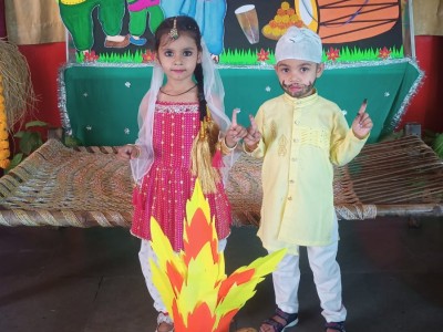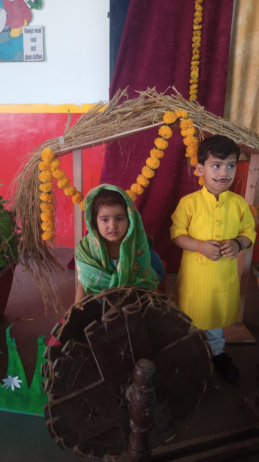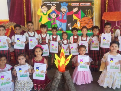Well planned activities to acquaint the students with this harvest festival were carried out from class nursery to ii, like samples of corn with their innovative craft ideas by using bud painting & finger printing, wheat grains, etc. Dhol craft activity was also performed by kids like paper pasting and then decorating it with stone stickers. It was a delight to see the tiny tots engrossed in these activities which were consciously designed to nurture the students curiosity about baisakhi.